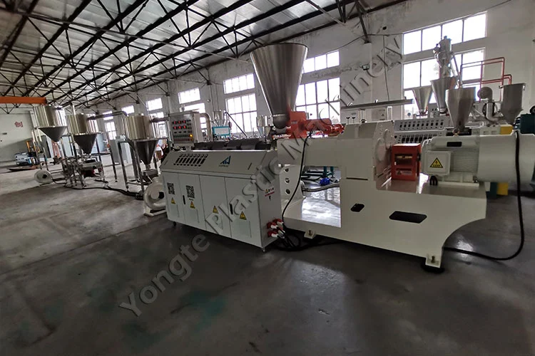 Во 2024 година, изработивме прилагодена машина за пелетизирање со ПВЦ соединенија за полски клиент, специјално дизајнирана да произведува ПВЦ главни гранули од рециклиран ПВЦ и полнење CaCO3. Содржината на полнење на CaCO3 може флексибилно да се прилагоди помеѓу 40% и 80% за да се усогласи со производствените спецификации на купувачот. Клучните компоненти вклучуваат автоматски фидер, конусен екструдер со две завртки SJSZ80/156 (мотор 75 kW со фреквентен инвертер ABB, троши ~ 50 KW за време на стабилна работа), жешка матрица за пелетизирање за еднообразно сечење гранули и систем за брзо ладење од три фази од не'рѓосувачки челик 304 и брз воздух за ладење. Машината постигнува производствен капацитет од 300-400 кг/час и е изградена за 24/7 континуирано работење со нула застој. Инсталирањето беше беспрекорно, поддржано од стручниот тим на Јонгте, кој обезбеди помош од крај до крај. По инсталацијата, обуката на лице место го овласти персоналот на клиентот вешто да управува со опремата, додека далечинската техничка поддршка преку видео насоки обезбеди брзо решавање на сите проблеми, одржувајќи непречено производство и врвни перформанси.